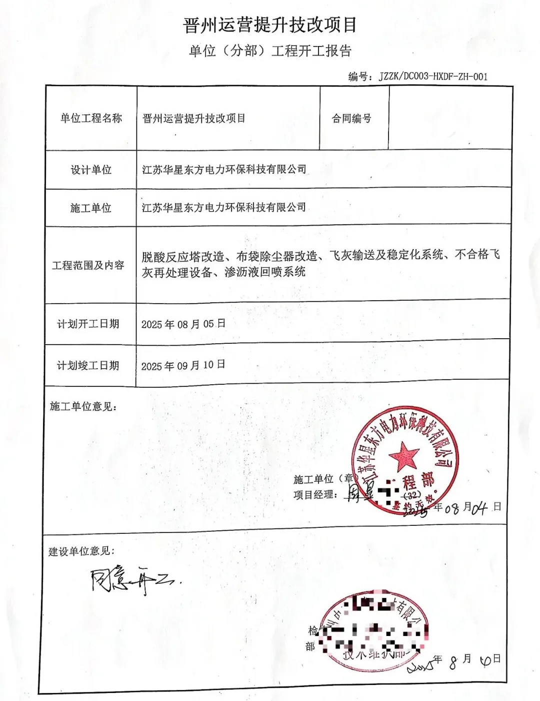华星东方承建的河北省石家庄市晋州市生活垃圾焚烧发电提升技改项目烟气净化工程于2025年08月05号开工建设,于08月27号已安装完成通过初步验收。