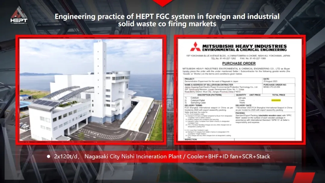 2023 FGC system of 2×120t/d MSW Incineration Power Plant in West Nagasaki, Japan: this whole system innovatively introduced and applied high-performance catalyst technologies, significantly optimizing the removal efficiency of nitrogen oxides, dioxins, and other harmful substances in flue gas, further enhancing overall FGC technical levels.
