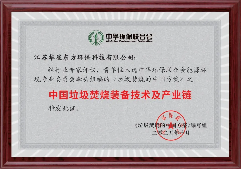 中华环保联合会主席王秀峰、全国政协人口资源环境委员会副主任委员翟青等领导出席开幕式并致辞,为环保产业高质量发展指引方向。在垃圾焚烧环保核心设备制造领域,江苏华星东方作为领军企业,凭借其卓越的技术实力和突出的行业贡献,成功入选中华环保联合会牵头组编的《垃圾焚烧的中国方案》之中国垃圾焚烧装备技术及产业链。这一荣誉的获得,是对华星东方多年来在垃圾焚烧装备技术研发、生产制造以及产业链整合等方面所取得成绩的高度认可。同时,公司董事长也凭借其在行业内的深远影响力和卓越领导力,入选《垃圾焚烧的中国方案》之“踏实留印的中国垃圾焚烧人物”。